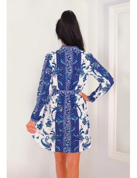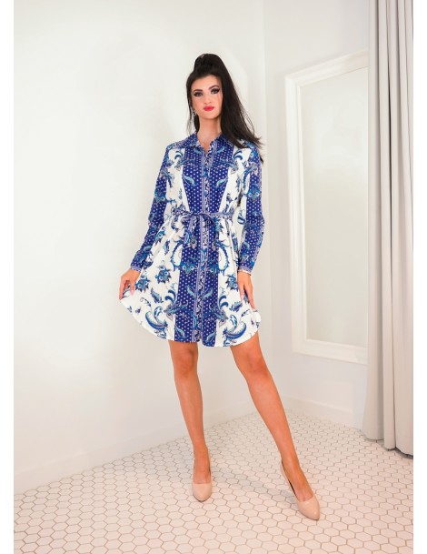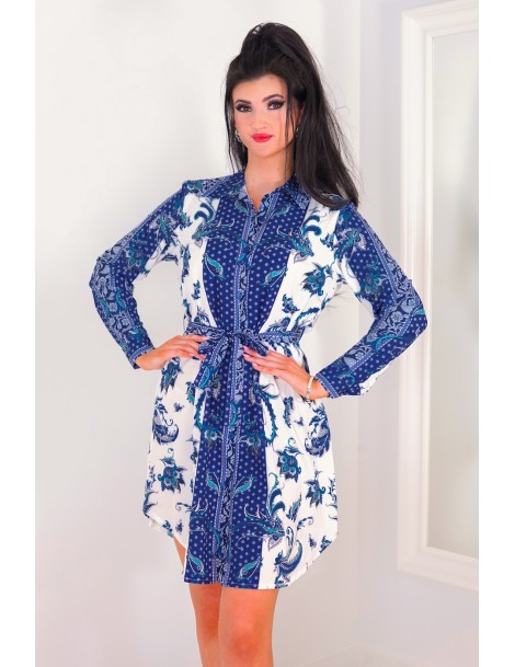 Koszulowa sukienka wykonana z wysokiej jakości białego materiału we wzory granatowo niebieskie. Krój koszulowy, zapinana na guziki, w talii regulowana materiałowym paskiem, dół półokrągły, długi rękaw zapinany na guziki przy mankietach.