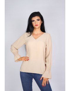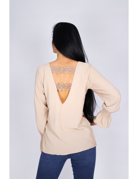 Elegancka bluzka z długim rękawem wykonana z wysokiej jakości gładkiego materiału w kolorze beżowym. Góra z dekoltem w serek, długie rękawy marszczone gumką, z tyłu odkryte plecy wkształcie litery V z elegancką gipiurą.
