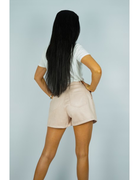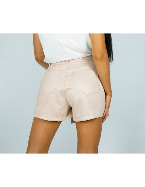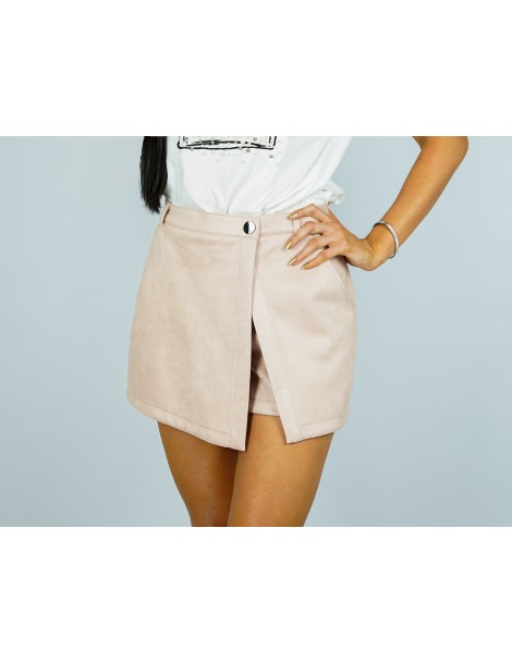 Eleganckie szorty zamszowe w kolorze pudrowego różu. Krój a'la spódnico-spodenki. Zapinane na ekspres i guzik. Posiadają kieszenie z przodu i z tyłu.