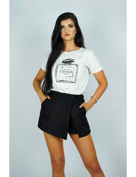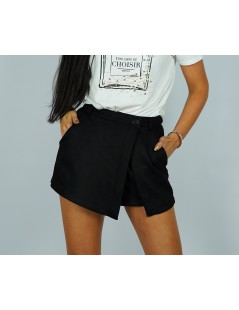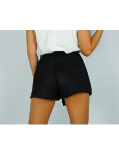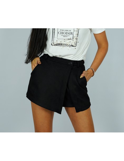 Eleganckie szorty zamszowe w kolorze czarnym. Krój a'la spódnico-spodenki. Zapinane na ekspres i guzik. Posiadają kieszenie z przodu i z tyłu.