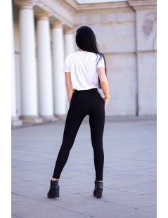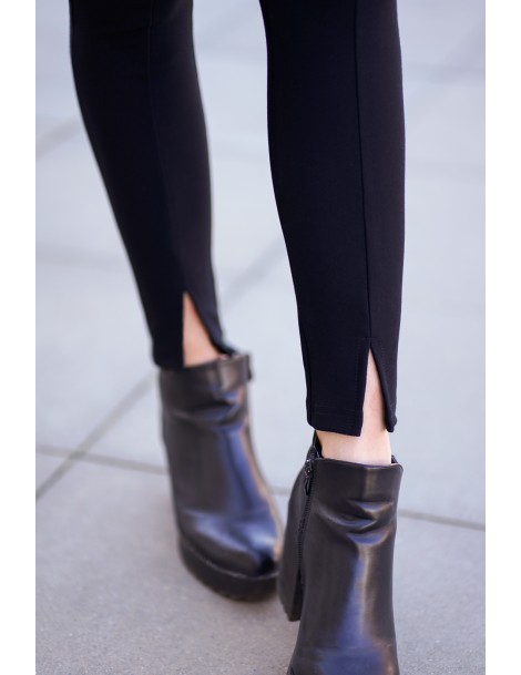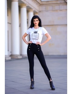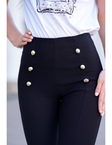 Eleganckie legginsy z wysokim stanem wykonane z wysokiej jakości materiału w kolorze czarnym. Góra zdobiona złotymi guzikami, przy nogawkach z przodu małe rozcięcia, z boku na biodrze zamek.