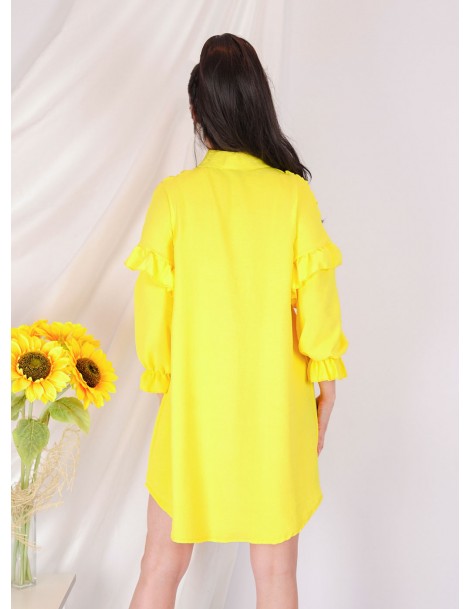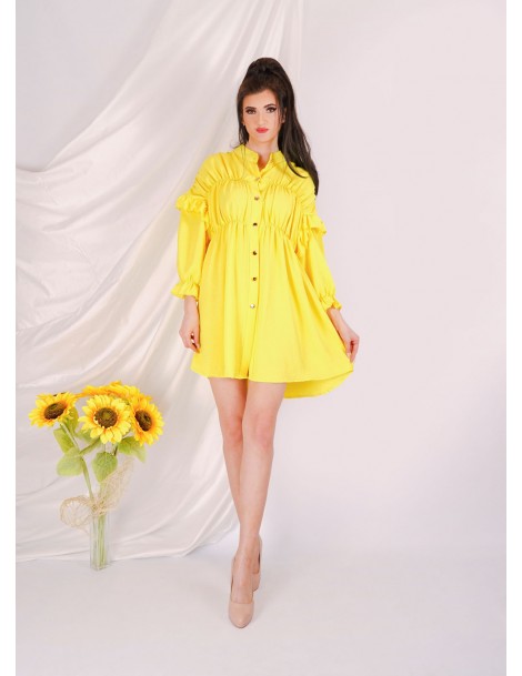 Sukienka oversize wykonana z wysokiej jakości materiału w kolorze zółtym. Góra ze stójką oraz marszczeniami, zapinana na guziki, luźna talia oraz dół, luźne rękawy 3/4 wraz z falbankami. Tył sukienki gładki.