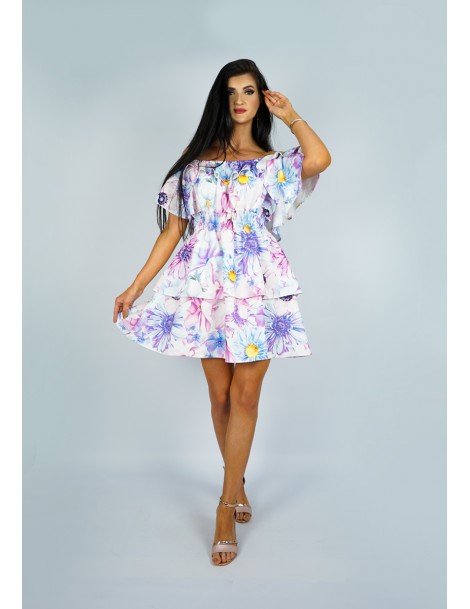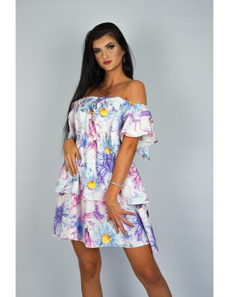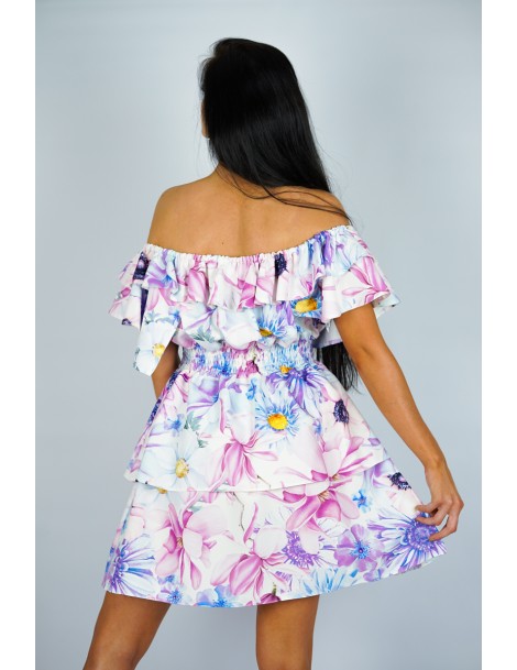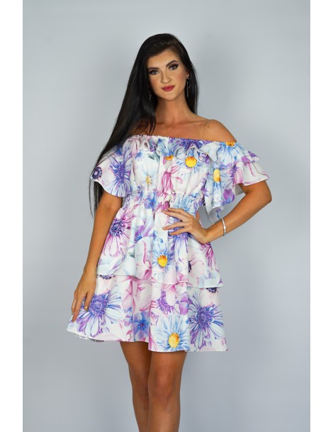 Sukienka hiszpanka w kwiaty niebiesko filetowe wykonana z wysokiej jakości materiału. Góra z opuszczonymi ramionami, w pasie elastyczna gumka, dwuwarstowy dół sukienki. Żywy kwiatowy wzór. Wygodna i efektowna.