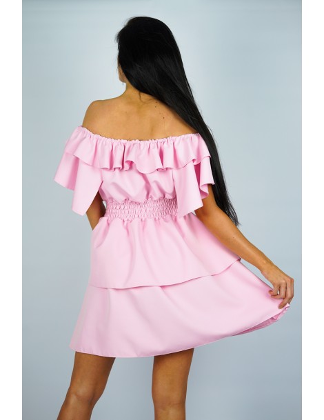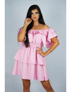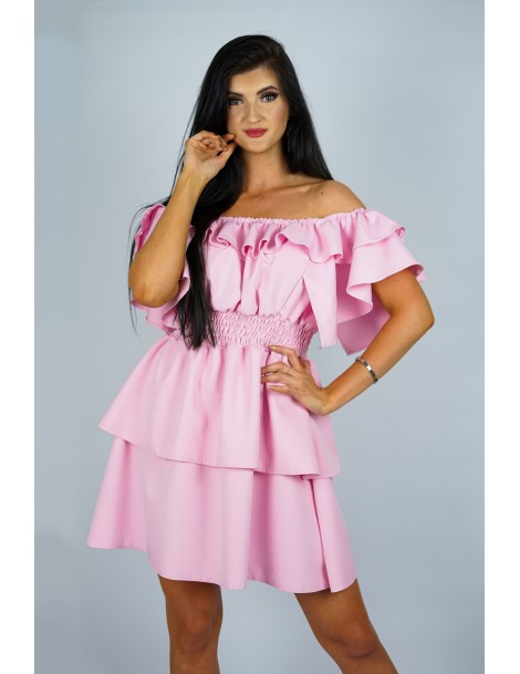 Sukienka hiszpanka w kolorze pudrowy róż, wykonana z wysokiej jakości materiału. Góra z opuszczonymi ramionami, w pasie elastyczna gumka, dwuwarstowy dół sukienki. Żywy kolor. Wygodna i efektowna.
