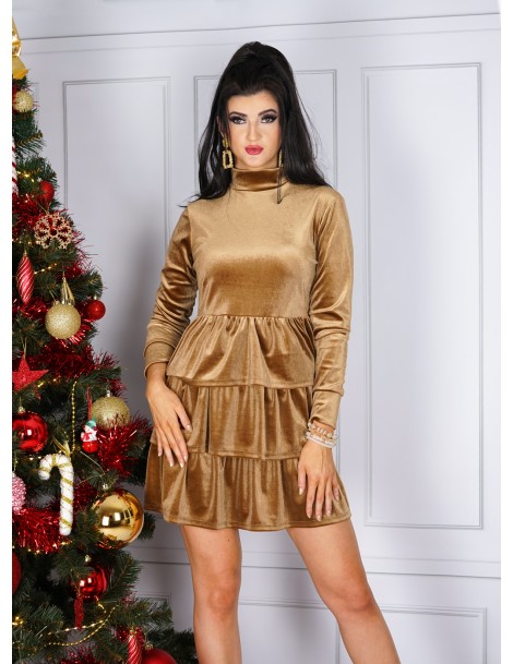 Elegancka sukienka z trzema falbankami i stójką wykonana z wysokiej jakości weluru w kolorze camel. Góra dopasowana ze stójką, długi rękaw, dół sukienki z trzema falbankami. Elastyczny materiał.