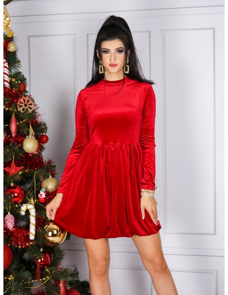 Elegancka sukienka wykonana z wysokiej jakości weluru w kolorze czerwonym. Góra dopasowana z zabudowanym dekoltem, dół podszyty w kształcie bombki, długie rękawy ze srebrnymi guzikami.