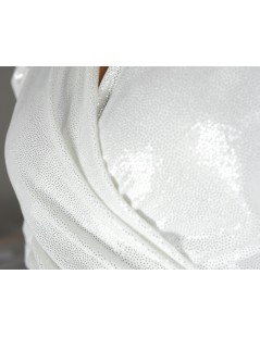 Elegancka, dopasowana sukienka z wysokiej jakości weluru w kolorze białym ze srebrnymi, błyszczącymi zdobieniami. Góra dopasowana o kroju kopertowym, dół dopasowany z regulowanym ściągaczem, rękawy z bufkami na ramionach.