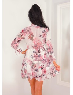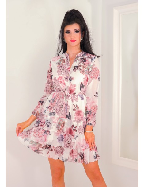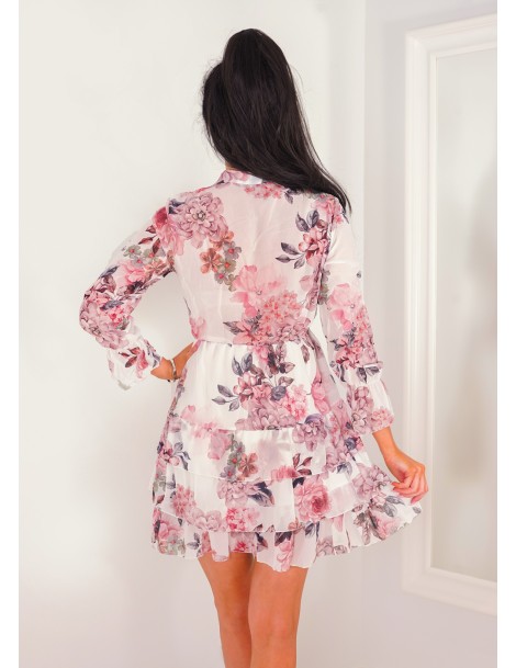 Elegancka sukienka w kwiaty wykonana z wysokiej jakości szyfonu w kolorze białym. Góra zapinana na guziczki, w talii elastyczna gumka wraz z kokardką, dół rozkloszowany z trzema falbankami, długi rękaw.