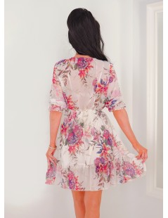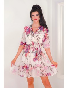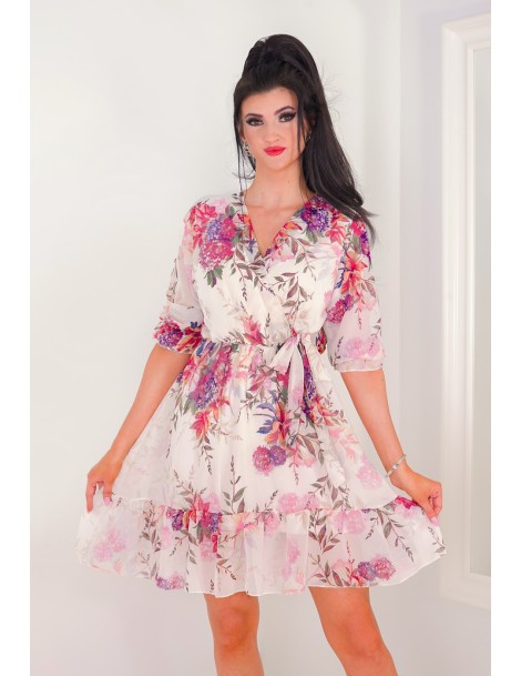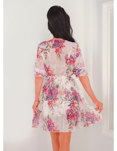 Elegancka sukienka wykonana z wysokiej jakości białego szyfonu w kwiatowy wzór. Góra kopertowa, w talii wiązana na kokardkę oraz elastyczna gumka, dół rozkloszowany z falbanką, rękaw 1/2.