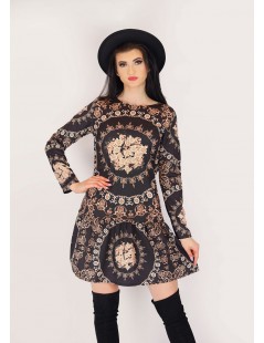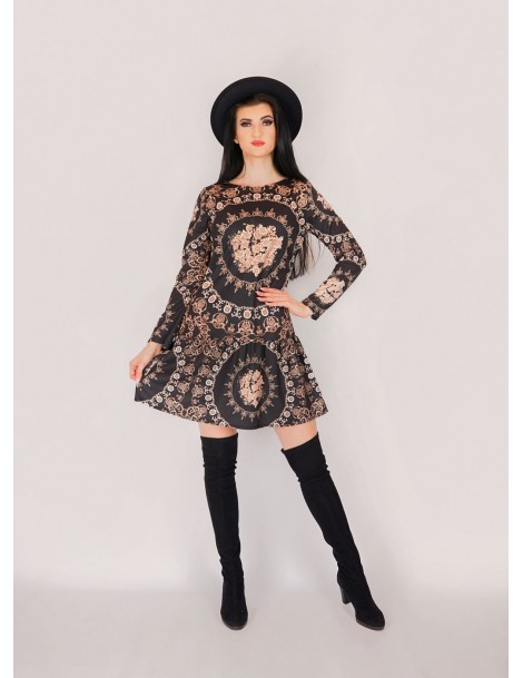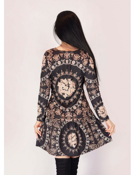 Sukienka wykonana z gładkiego materiału w kolorze czarnym w złote etniczne wzory. Góra z okrągłym dekoltem, luźna talia, dół z falbanką, długie rękawy.