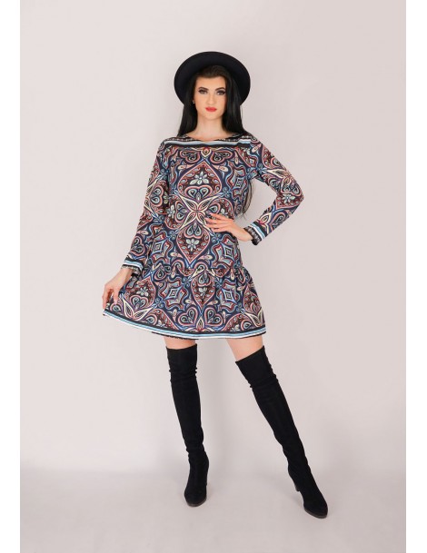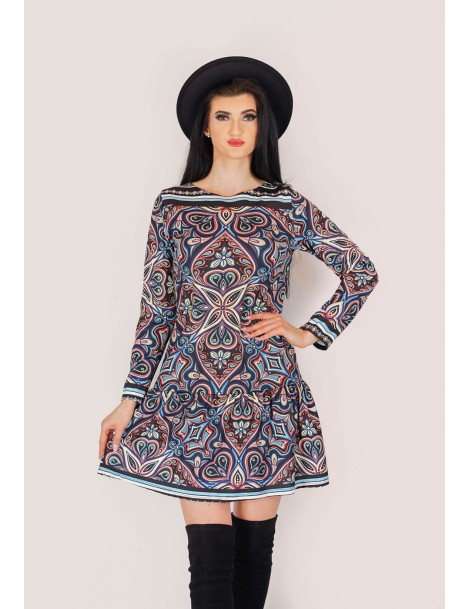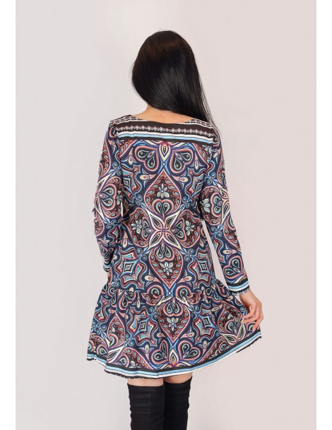 Sukienka wykonana z gładkiego materiału w kolorze czarnym w niebieskie etniczne wzory. Góra z okrągłym dekoltem, luźna talia, dół z falbanką, długie rękawy.
