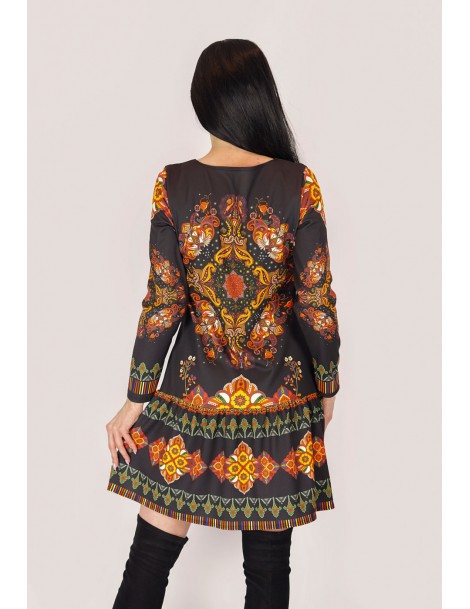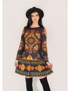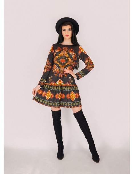 Sukienka wykonana z gładkiego materiału w kolorze czarnym w pomarańczowe etniczne wzory. Góra z okrągłym dekoltem, luźna talia, dół z falbanką, długie rękawy.