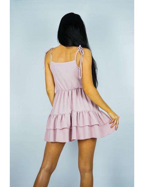 Zwiewna sukienka w kolorze brudnego różu, wykonana z wysokiej jakości materiału. Góra z regulowanymi ramiączkami, w pasie elastyczna gumka, dół rozkloszowany z falbankami. Wygodna i elegancka.