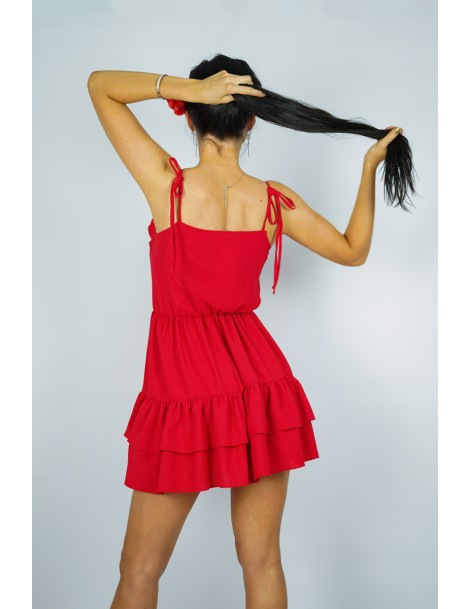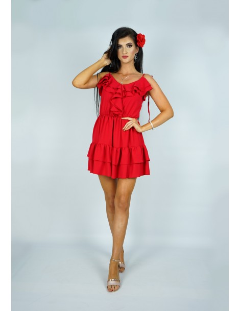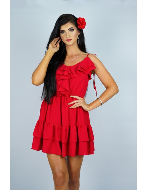 Zwiewna sukienka w kolorze czerwonym, wykonana z wysokiej jakości materiału. Góra z regulowanymi ramiączkami, w pasie elastyczna gumka, dół rozkloszowany z falbankami. Wygodna i elegancka.