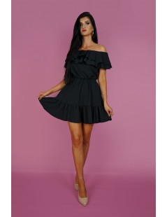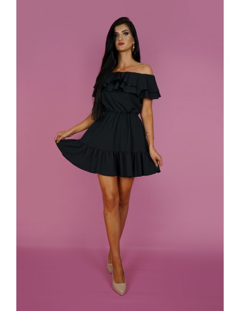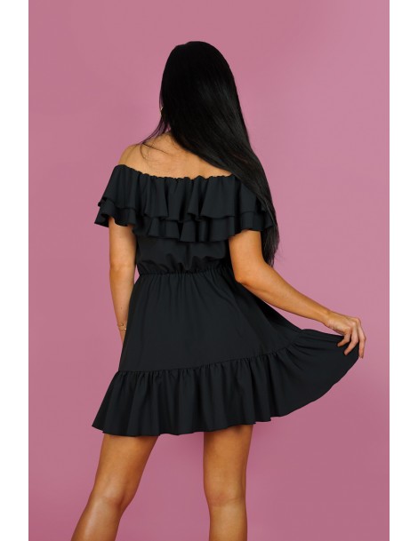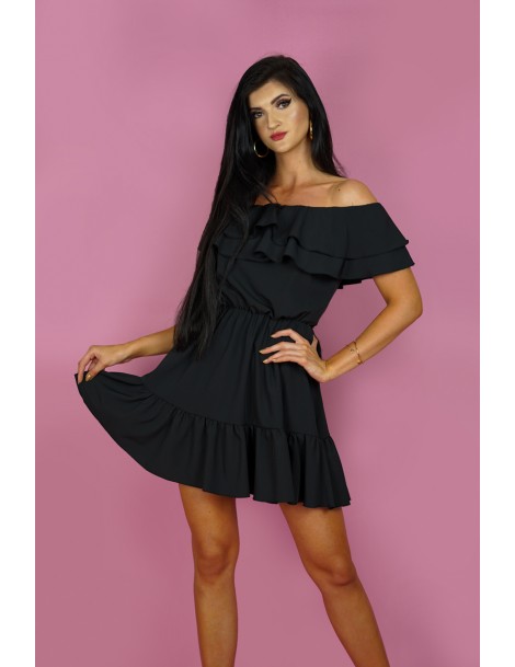 Kobieca sukienka hiszpanka w kolorze czarnym, wykonana z bardzo dobrej jakości materiału. Góra z opuszczonymi ramionami i falbankami, w pasie elastyczna gumka, dół rozkloszowany z falbanką. Kobieca i elegancka.