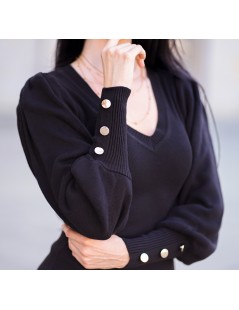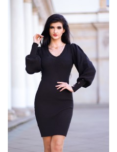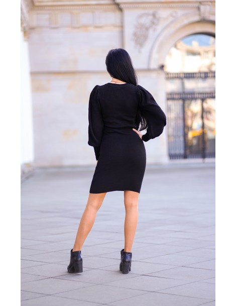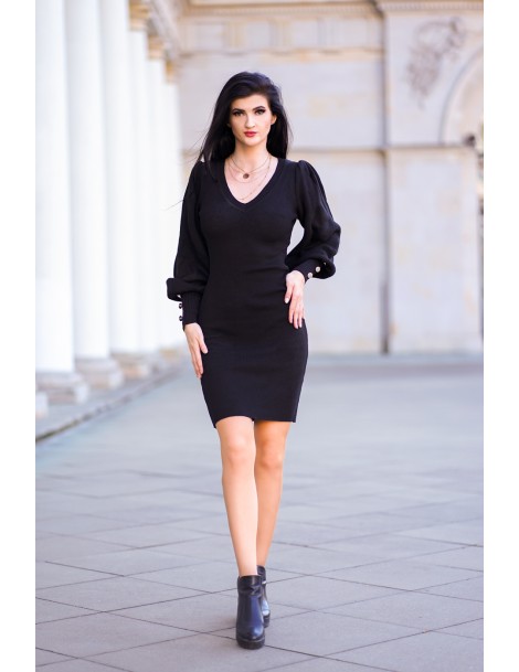 Zjawiskowa sukienka sweterkowa wykonana z wysokiej jakości materiału w prążek w kolorze czarnym. Góra z dekoltem w serek, bufiaste, długie rękawy ze złotymi guzikami, talia i dół dopasowany. Długość przed kolano.