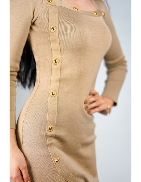 Dopasowana sukienka wykonana z wysokiej jakości materiału w kolorze beżowym. Góra z okrągłym dekoltem, ozdabiana złotymi guzikami, dół z rozcięciem. Długość przed kolano.