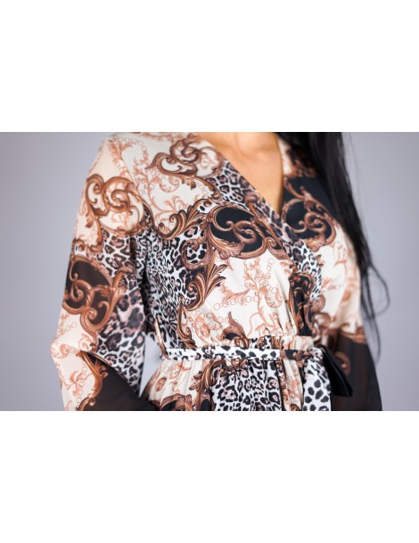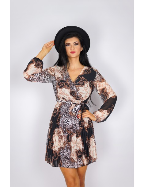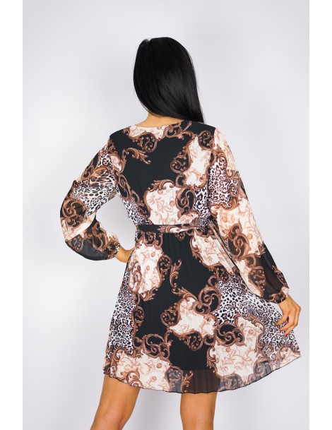 Elegancka sukienka rozkloszowana w kolorze czarno-beowym w ornament print i panterkę. Góra z kopertowym dekoltem, długi rękaw, w talii rozciągliwa gumka zakryta materiałowym paskiem wiązanym z przodu na kokardkę, dół rozkloszowany, plisoway. Idealnie sprawdzi się na co dzień jak również na eleganckie wyjście.