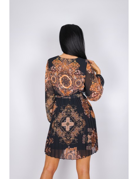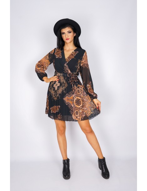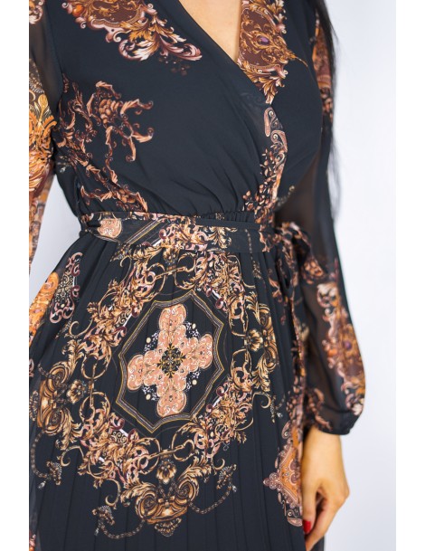 Elegancka sukienka rozkloszowana w kolorze czarnym w ornament print. Góra z kopertowym dekoltem, długi rękaw, w talii rozciągliwa gumka zakryta materiałowym paskiem wiązanym z przodu na kokardkę, dół rozkloszowany, plisoway. Idealnie sprawdzi się na co dzień jak również na eleganckie wyjście.