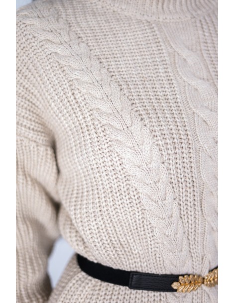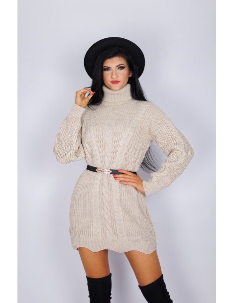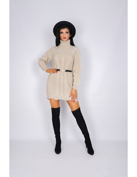 Sukienka sweterkowa wykonana z grubego, ciepłego materiału z warkoczami. Góra z dużym, ciepłym golfem, długi rękaw, dół falowany. Bardzo ciepła sukienka na chłodne dni.