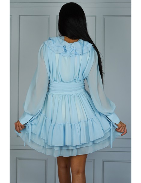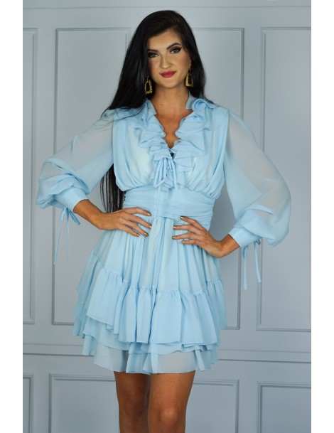 Klasyczna sukienka w kolorze błękitnym wykonana z wysokiej jakości szyfonu. Góra z długim przewiewnym rękawem i falbankami przy dekolcie, dół rozkloszowany z falbanami. Zwiewna, lekka i kobieca. Sprawdzi się na wesele jak również podczas kolacji.