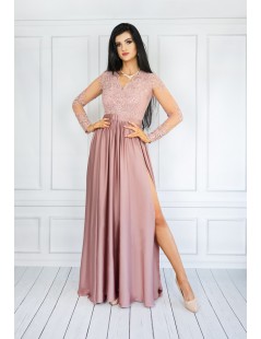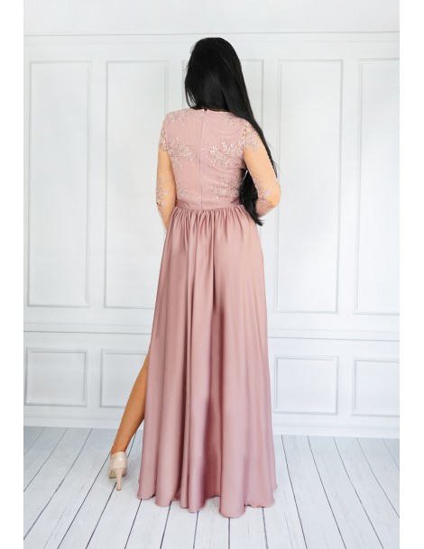Klasyczna długa sukienka maxi z koronkowymi rękawami w kolorze brudny róż. Góra koronkowa z cekinami, w talii podkreślona paskiem materiału, dół z rozcięciem z lejącego materiału a'la satyna. Idealnie sprawdzi się podczas uroczystości takich jak wesele, studniówka, bal licencjacki czy sylwester.