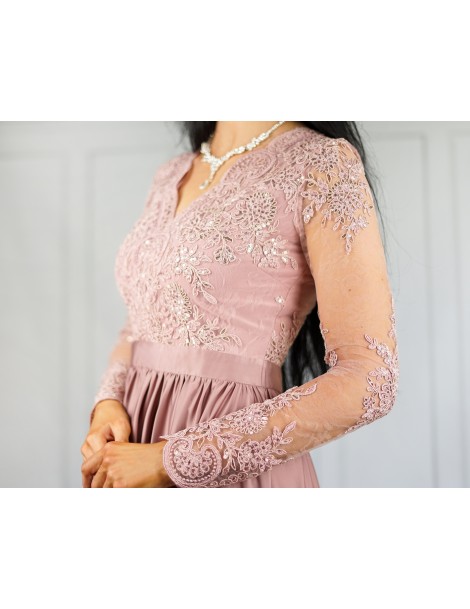 Sukienka maxi z koronkowymi rękawami w kolorze brudny róż. Sprawdzi się idealnie na wesele, sylwestra lub studniówkę.