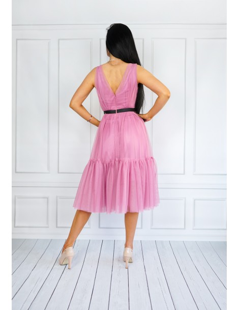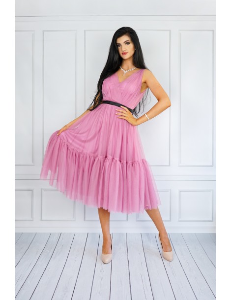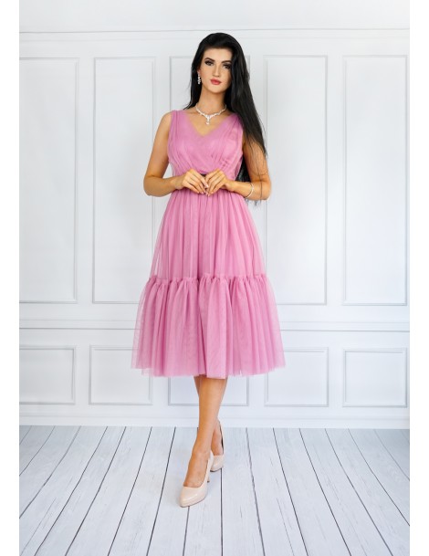 Sukienka midi wykonana z tiulu w kolorze różowym. Sprawdzi się idealnie na wesele, sylwestra lub studniówkę.