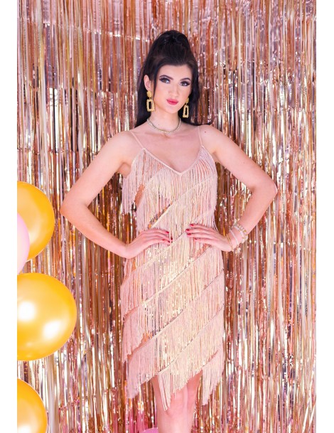 Wyjątkowa sukienka ze złotymi cekinami i frędzlami w kolorze kremowym. Góra z dekoltem w serek i regulowanymi ramiączkami, tyl z lekko odkrytymi plecami. Elastyczny materiał.