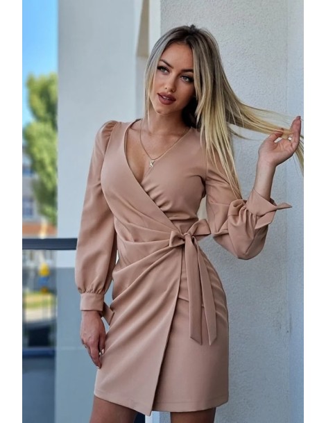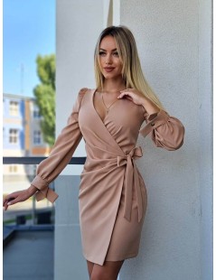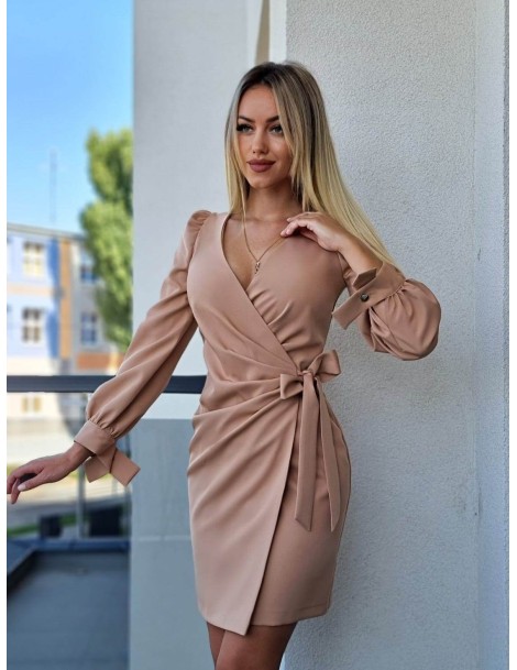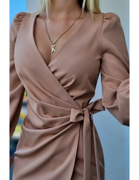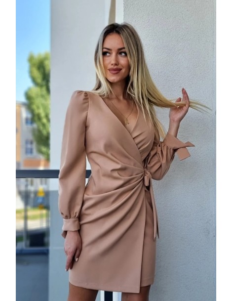 Sukienka kopertowa z długim rękawem wiązana ciemny beż